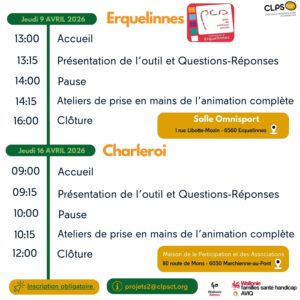 Le 9 avril à Erquelinnes de 13h à 16h et le 16 avril à Charleroi de 9h à 12h. Accéder au programme INSCRIPTION Navigation de commentaireOnglet précédent Onglet précédent FORMATIONS CLPSCT 2026Articles liésFORMATIONS CLPSCT 2026janvier 16, 2026Prévenir le harcèlement !juin 20, 2025L’Actu Evrasjanvier 21, 2025Emotika – outil ludopédagogique sur les émotionsavril 27, 2021Nouveau site STOP Violences-Femmesavril 3, 2018